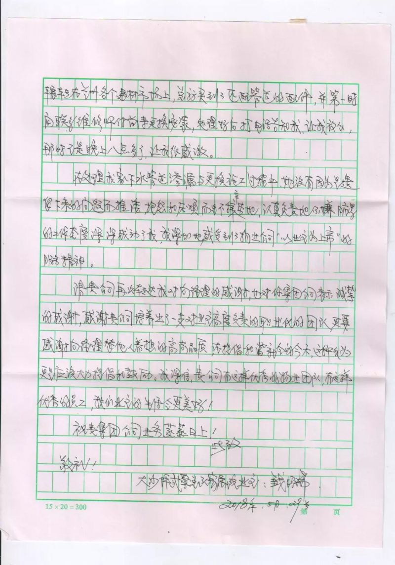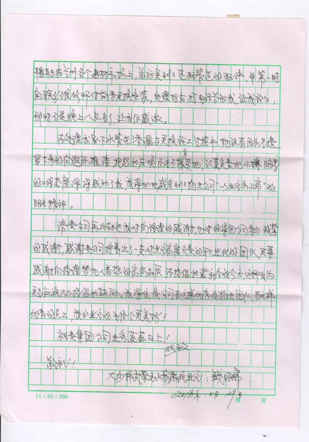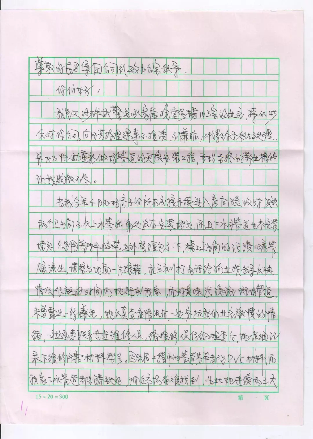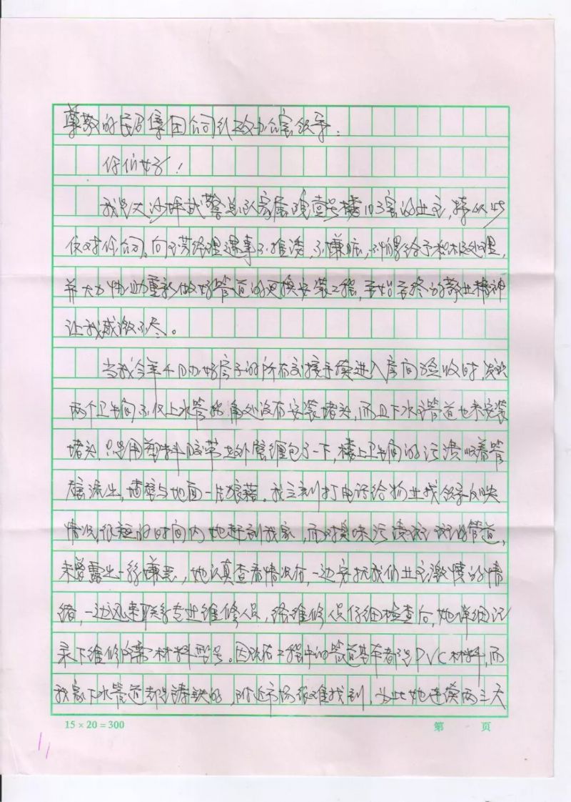 在為錢先生解決下水管道滲漏問題及安裝更換的過程中,向玉芳經(jīng)理沒有一絲推諉,沒有一句抱怨,不嫌臟亂、認(rèn)真負(fù)責(zé)的工作態(tài)度得到了業(yè)主的肯定和贊譽(yù)。業(yè)主錢先生特意寫來感謝信,以此來表達(dá)對(duì)向玉芳經(jīng)理的感激之情,及對(duì)城關(guān)物業(yè)服務(wù)工作的肯定和贊揚(yáng)。