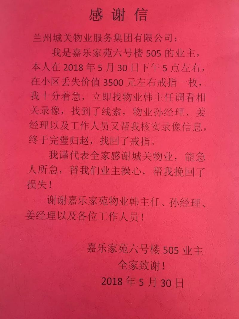 家住嘉樂家苑6號(hào)樓505的業(yè)主林女士,不慎將一枚戒指遺失在小區(qū)內(nèi)。丟失了戒指的林女士萬分著急,來到物業(yè)服務(wù)中心尋求幫助。城關(guān)物業(yè)嘉樂家苑項(xiàng)目部經(jīng)理韓元春得知情況后,立刻調(diào)閱查看當(dāng)天監(jiān)控視頻,經(jīng)過仔細(xì)排查后找到了相關(guān)線索,并順利尋回失物,及時(shí)挽回了業(yè)主的財(cái)產(chǎn)損失?吹浇渲竿觇禋w趙后的李女士感激萬分,特將感謝信送至公司,以此表達(dá)對(duì)城關(guān)物業(yè)的贊揚(yáng)。