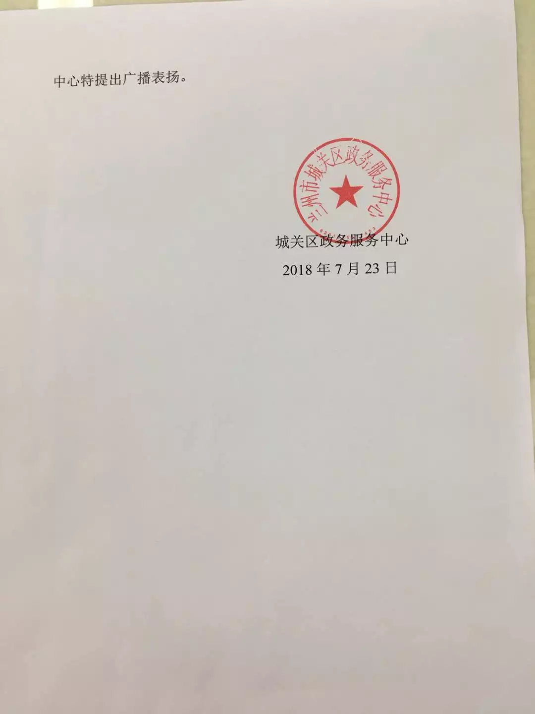 ▲城關區(qū)政務服務中心給城關物業(yè)馬文貴和余會明的感謝信