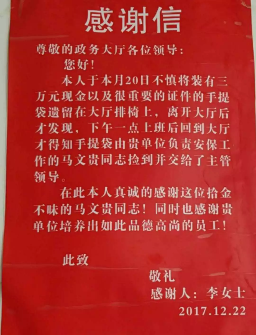 在他還有秩序維護員余會明、程斌的眼里看起來“很平常的事”,深深感動了很多人,城關區(qū)政務服務中心和錢款失而復得的李女士,都給他們送去了感謝信。感謝他們的見義勇為,保衛(wèi)了他人的生命安全,感謝他們拾金不昧,化解了他人的重大損失。