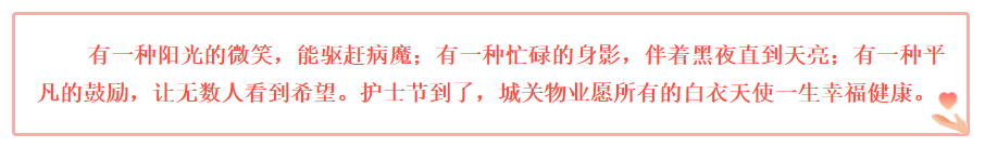 是每一個(gè)微小卻又強(qiáng)大的他們, 治愈著我們的身心, 守護(hù)著我們的生命安全。 因?yàn)橛兴麄儯?/span> 病毒來(lái)襲時(shí)我們不再害怕, 因?yàn)橛兴麄儯?/span> 我們才看到了這場(chǎng)戰(zhàn)“疫”的希望…… 讓我們一起, 向所有奮斗在工作崗位上的白衣天使, 致敬! 祝所有白衣天使節(jié)日快樂(lè)! 你們辛苦了!