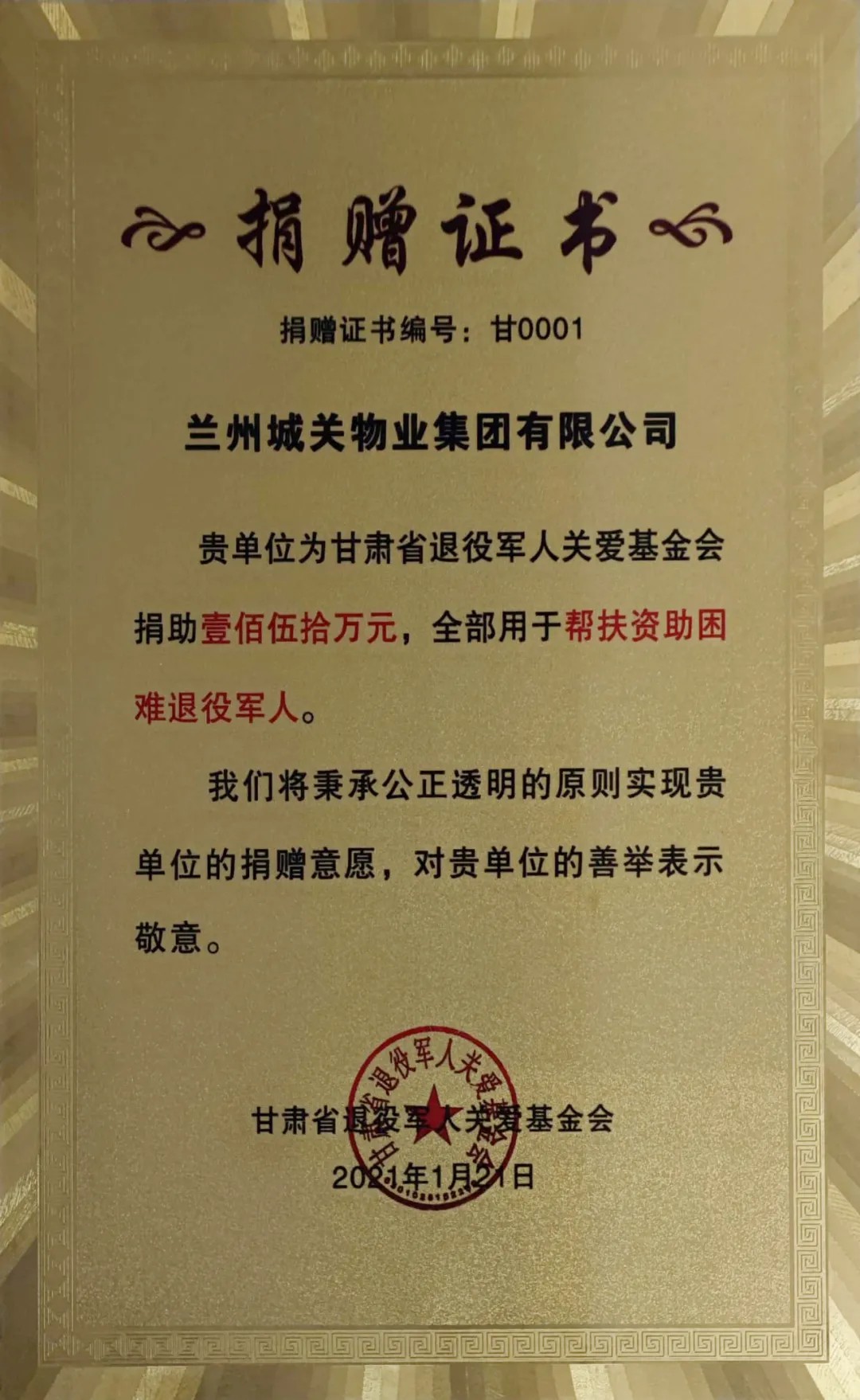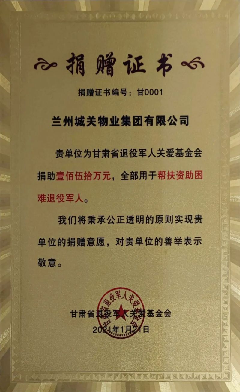 蘭州城關(guān)物業(yè)服務(wù)集團(tuán)有限公司積極支持國防和軍隊(duì)建設(shè),襄助退役軍人扶危濟(jì)困事業(yè),向甘肅省退役軍人關(guān)愛基金捐助150萬元善款,以實(shí)際行動(dòng)為幫助退役軍人就業(yè)、解決退役軍人生產(chǎn)生活困難、加強(qiáng)軍政軍民團(tuán)結(jié)工作貢獻(xiàn)力量、“錦上添花”。