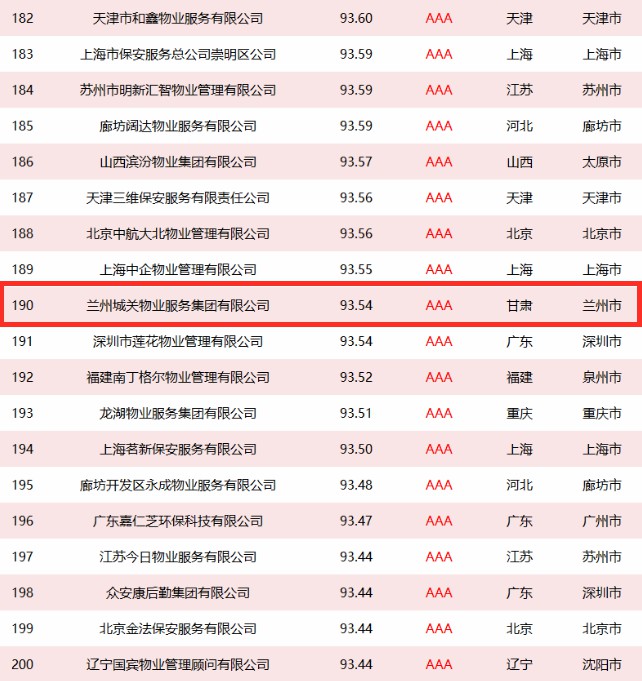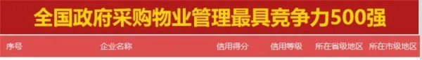 3月12日,政府采購大數(shù)據(jù)研究院和政府采購大數(shù)據(jù)網(wǎng)聯(lián)合發(fā)布了全國政府采購物業(yè)管理服務(wù)最具競爭力500強,城關(guān)物業(yè)憑著過往良好的履約情況和風(fēng)險管控能力成功入選,以93.54分的信用得分榮獲第190名,成為甘肅省唯一入選前500強的企業(yè)。