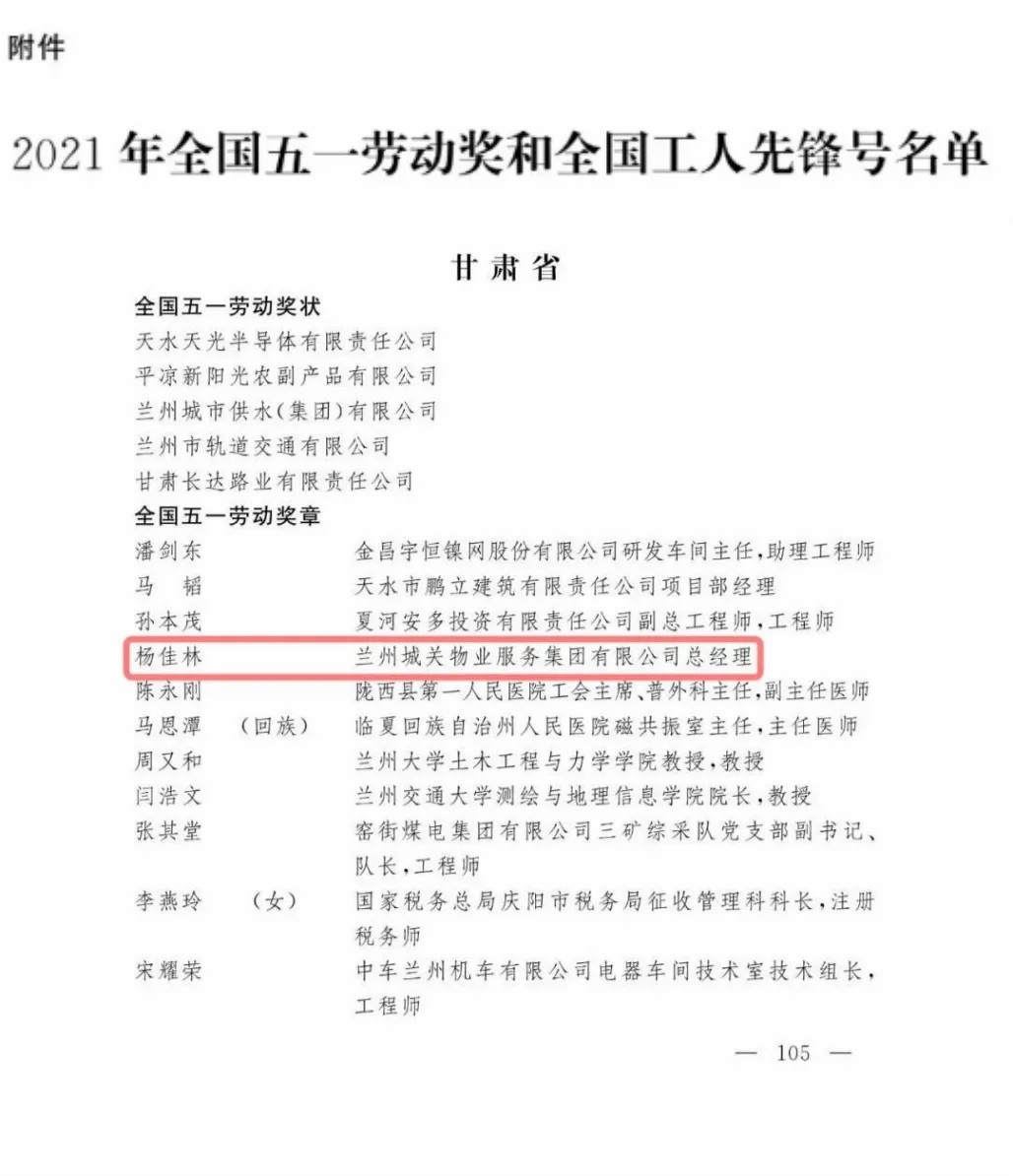 作為一名年輕的企業(yè)家,楊佳林在企業(yè)中積極推動“黨工共建”,實現(xiàn)企業(yè)民主管理的制度化、常態(tài)化,在全面打贏脫貧攻堅戰(zhàn)的過程中,蘭州城關(guān)物業(yè)主動對接貧困山區(qū),充分挖掘社區(qū)消費潛力,建立消費扶貧產(chǎn)品的“綠色通道”,以實際行動助力鄉(xiāng)村振興。正是因為楊佳林對社會和時代的責(zé)任感,在他的帶領(lǐng)下,蘭州城關(guān)物業(yè)先后獲得“全國五一勞動獎狀”“全省非公經(jīng)濟(jì)黨建示范點”等300余項榮譽,楊佳林本人也相繼獲得了 “甘肅省五一勞動獎?wù)隆、“甘肅物業(yè)行業(yè)貢獻(xiàn)獎”、“甘肅省技術(shù)標(biāo)兵”、全省百萬職工職業(yè)技能素質(zhì)提升活動“優(yōu)秀組織者”、蘭州市首批“金城創(chuàng)新創(chuàng)業(yè)非公企業(yè)家”等多項榮譽。